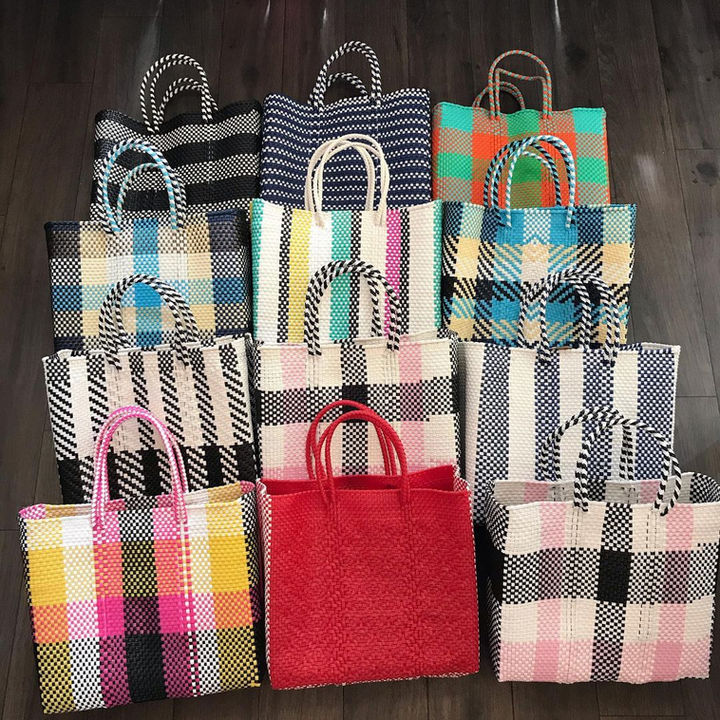市場(メルカド)の八百屋や乾物屋の軒先をふと見上げると目に留まるカラフルなバッグ。